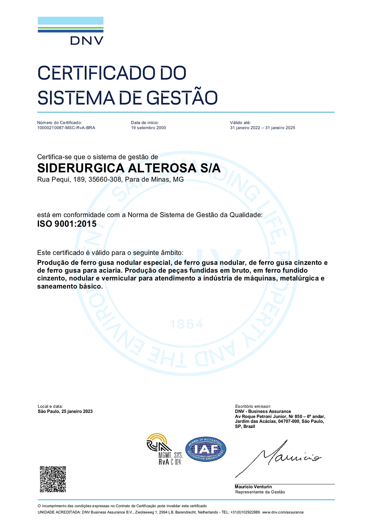Todas as atividades, produtos e serviços da Siderúrgica e Fundição Alterosa dentro desse escopo estão incluídas no seu sistema de gestão integrado da qualidade, meio ambiente, saúde, segurança ocupacional e proteção de dados pessoais.